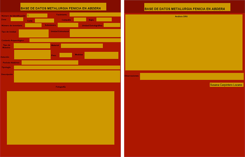 Se recogen en primer lugar los datos relativos a la campaña de excavación: nº de identificación de la base de datos, yacimiento, zona, corte, campaña, sigla, nº de inventario, subnúmero, unidad estratigráfica, tipo de unidad, unidad estructural y contexto arqueológico; después referencias relacionadas directamente con la pieza como el tipo de muestra, material, peso, medidas, datación, período histórico, tipología, descripción, fotografía, analítica (si la hubiese) y observaciones. Presentamos a continuación una plantilla modelo de la base de datos que hemos comentado indicando los campos donde se recoge la información de cada pieza.