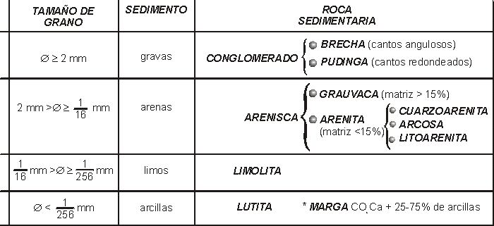 (pudingas y brechas), areniscas, lutitas (limolitas,
