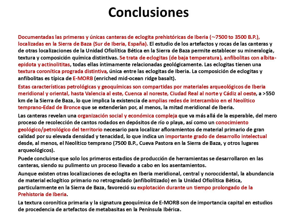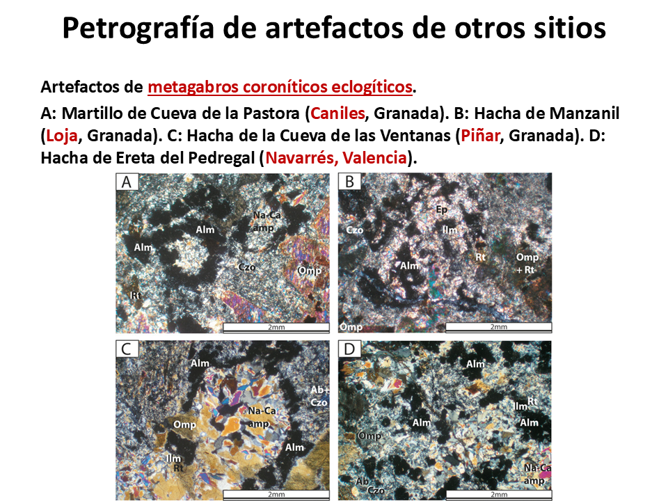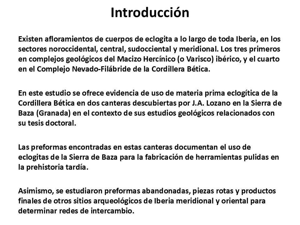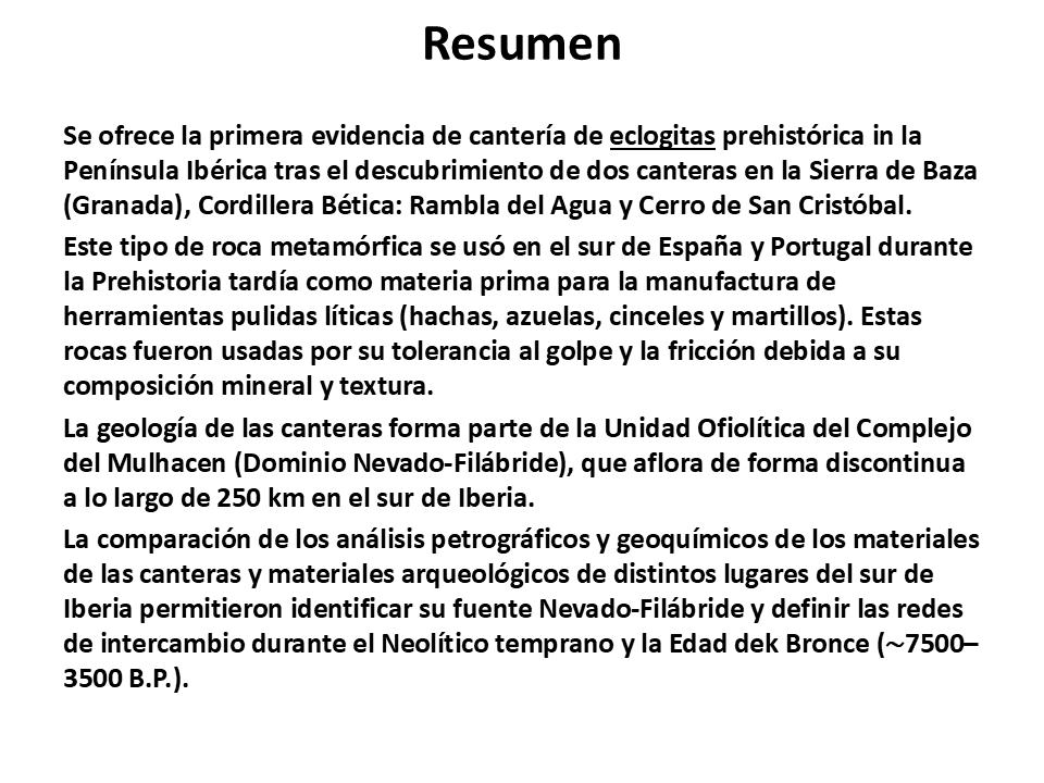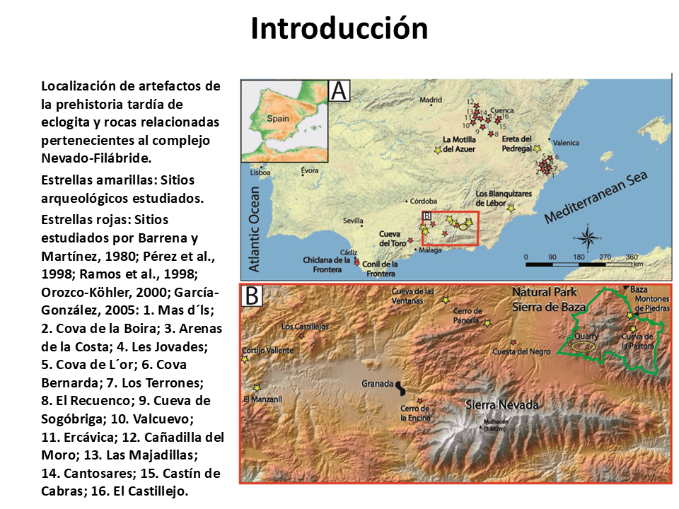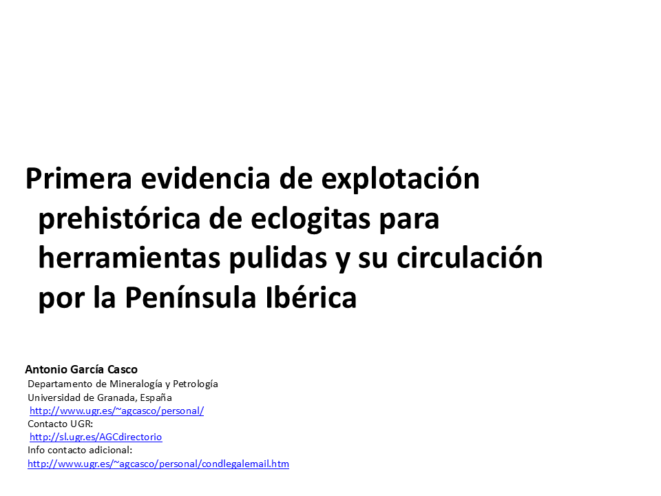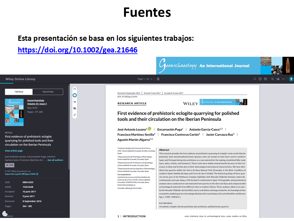 2018. José Antonio Lozano, Encarnación Puga, Antonio García-Casco, Francisco Martínez-Sevilla, Francisco Contreras Cortés, Javier Carrasco Rus, Agustín Martín-Algarra. First evidence of prehistoric eclogite quarrying for polished tools and their circulation on the Iberian Peninsula. Geoarchaeology 33, 364-385; doi: