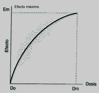 La representación gráfica de la relación dosis-respuesta generalmente es una nube de puntos, pero idealmente se aproxima a una hipérbola que muestra cómo al aumentar la dosis se incrementa el efecto hasta llegar a una dosis (Dm) en que se alcanza un efecto máximo, y la curva se hace asintótica. Pero en ocasiones, la correlación fluctúa y gráficamente se obtiene una curva sigmoidea, que es lo que ocurre con mayor frecuencia cuando se representan los datos correspondientes a muchos individuos y varias dosis.