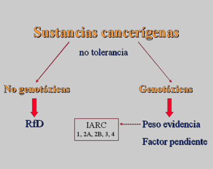 En primer lugar hay que distinguir los cancerígenos "no genotóxicos" y los "genotóxicos". A los primeros, es decir, aquellos que no afectan al material genético, se les puede aplicar todo lo dicho para los agentes no cancerígenos, es decir la DDA como nivel de seguridad para el consumidor. Sin embargo, en los cancerígenos genotóxicos, llamados así por actuar directamente sobre el material genético, se considera que no hay dosis libre de riesgo y por lo tanto cualquier dosis, por mínima que sea, puede tener consecuencias a largo plazo sobre la salud del consumidor (tolerancia cero). Resulta evidente que la única manera de salvaguardar la salud del consumidor sería evitando la presencia de estos contaminantes en los alimentos, situación que, en la mayoría de los casos, resulta totalmente imposible. En la práctica, la evaluación de los agentes cancerígenos se hace según: