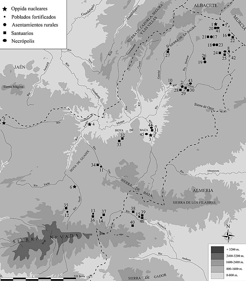 A modo de resumen, podemos decir que los yacimientos estudiados son santuarios exteriores al ámbito urbano (a veces periurbanos, como el Cerro del Castillo de Galera, a veces claramente extraurbanos, de tipo territorial, como en el complejo Cuesta Blanca, Baza), pero íntimamente conectados con el entorno natural en el que se ubican. Características como la ausencia de estructuras en superficie, la especificidad del material cerámico, la ubicación en zonas de gran visibilidad, ayudan a documentar estos lugares sacros, que se circunscriben al territorio bastetano; incluso podía ser un indicio para definir esta zona, diferente a la que le rodea, por lo menos en el aspecto sacro. ¿Podríamos decir que esta área engloba a los habitantes que los romanos denominaron como bastetanos? Es una pregunta difícil de contestar, porque hay que tener en cuenta otros elementos, no sólo los de orden religioso; pero alejándonos de estas cuestiones, queda clara la especificidad de estos espacios, que no responden a un patrón de asentamiento único, dependiendo de los núcleos poblacionales que los vieron nacer, aunque sean exponentes específicos, en lo que hasta ahora se conoce, de lo que denominamos cultura bastetana.
