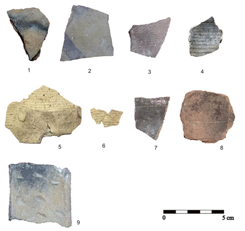 1) Pintado/Esgrafiado; 2) Pintado; 3) Cepillado; 4) Estriado; 5) Estriado; 6) Estriado; 7) Línea incisa; 8) Línea incisa; 9) Ungulación.