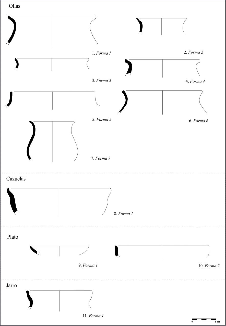 Forma 1 (7,6%). Esta forma se caracteriza por un perfil abierto, de paredes bajas con tendencia globular, con espacio para una posible tapadera y una gruesa acanaladura en la parte exterma del cuello, seguida por una carena y marcas de exposición al fuego. Una forma muy parecida se encuentra en la Catedral de Santa María en Vitoria-Gasteiz datada entre los siglos IX-XI (SOLAUN BUSTINZA 2005: 152, responde a la forma Cazuela I-Ia).