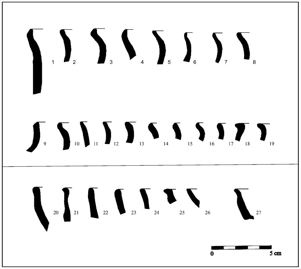 Si atendemos a cada serie, en el caso de las ollas que presentan un cuerpo globular, son, sin lugar a dudas, las más representativas (71,4%). Se han podido distinguir hasta siete formas distintas, algo que ha sido muy complejo puesto que las formas no están estandarizadas. A pesar de compartir rasgos comunes heredados de la etapa tardoantigua (PEÑIL MÍNGUEZ et al. 1986: 227), ninguna olla presenta perfiles claramente fijados, es decir, todas ofrecen formas globulares exvasadas pero con una variabilidad significativa en los cuellos, labios, capacidad, etc. Sobre el resto de formas, poco es lo que podemos reseñar, puesto que son menos abundantes en el registro y atendiendo otra vez a esa gran variedad de formas. Sobre el jarro, no hemos podido conocer el tipo de asa que portaría, aunque se ha asociado una recuperada en el registro y comúnmente vinculada a este tipo de recipientes. Probablemente, el pico vertedor, no presente en el registro, estaría adosado al propio cuerpo, al igual que sucede en otros ejemplares del mirador ubicado en el cerro del Castillo (PÉREZ RODRÍGUEZ 1994).