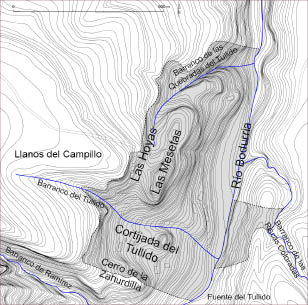 En el interior de la zona de explotación, entre Las Hoyas y el río Bodurria existen tres grandes promontorios, cuyo tamaño decrece al ir alejándose de la Cortijada del Tullido. Los dos primeros, que hemos venido a denominar La Meseta 1 y 2 cuentan con sendos yacimientos arqueológicos (SÁNCHEZ 1991:57-62), siendo el de mayor envergadura el que se encuentra en la primera de ellas, pues además se extiende hacia el sur y este, descendiendo por la ladera.
