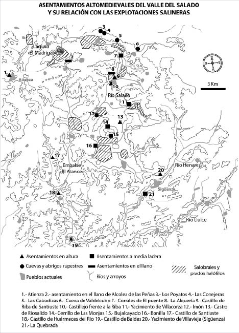 Ya hemos visto como los asentamientos de época altomedieval localizados en el valle se localizan, fundamentalmente, en el entorno más inmediato de las zonas salinas y por lo general a una cierta altura en la media ladera de los cerros y sierras. Los asentamientos en altura, no obstante, quedan fuera de esta relación tan inmediata, e incluso en el caso de la Riba de Santiuste, el castillo que parece los cristianos en el momento de la conquista consideraron como centro rector desde un punto administrativo de las salinas, se sitúa en un espacio en el que este tipo de centros no es abundante en absoluto.