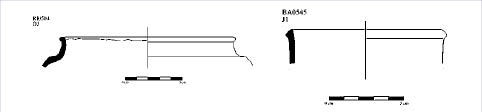 Fig. 2 Tipos cerámicos más representados. A la izquierda marmita de forma globular con escotadura en el cuello; y a la derecha jarro caracterizado por un borde con moldura triangular y base convexa.