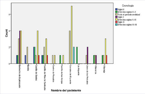 Junto al estudio de las características tecnológicas de la cerámica, no hemos desechado el estudio decorativo y tipológico. (Fig. 2) En este último caso, hemos propuesto un primer catálogo de formas y tipos de la cerámica andalusí en el valle del Salado (GARCÍA-CONTRERAS, En prensa-b), sujeto siempre a revisión debido a la naturaleza de la investigación y la procedencia de las piezas, todas ellas de prospección. Aunque incompleto, ya que muchos grupos no están representados, y falto de más y mejores comparativas con otros conjuntos de al-Andalus, sobre todo con los provenientes de las excavaciones arqueológicas más cercanas, este estudio tipológico nos ha permitido además comenzar a fechar los yacimientos, y establecer unas primeras pautas de evolución del poblamiento (Fig. 3).