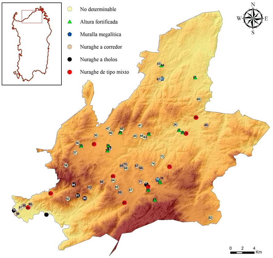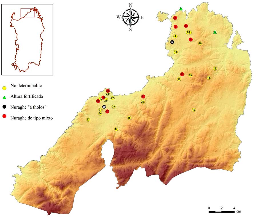 Desde el punto de vista de la ubicación topográfica de los yacimientos pertenecientes a toda el área de muestra, el análisis de los datos arqueológicos en función de la temática geográfica ha consentido determinar la casi total ausencia de asentamientos sobre los relieves más elevados. Las razones de tal escasez de yacimientos deben ser atribuidas principalmente a la asperidad de las zonas de montaña más elevadas de Gallura y a sus características inapropiadas para la vida (PAPURELLO 2001).
