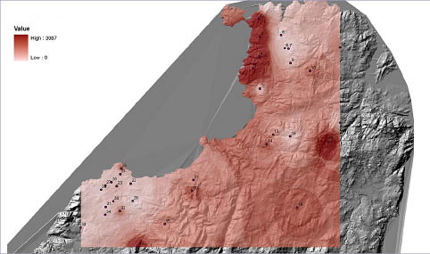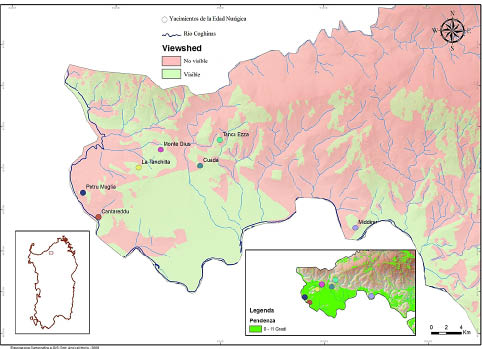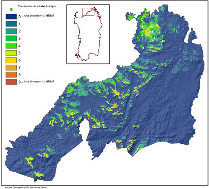 Además, el empleo del programa ArcGis 9.2 ha hecho posible la aplicación de una serie de análisis específicos destinados a verificar la visibilidad del territorio a partir de la ubicación de los yacimientos de edad nurágica y evaluar el control ejercitado sobre áreas económicamente ventajosas (CRIADO 1993:2; GONZÁLES 2001:130-131; CÁMARA et al. 2008). El cálculo de la visibilidad compresiva del territorio ha sido realizado mediante la aplicación Viewshead (WHEATLEY 1995:171-186; VAN LEUSEN 1999; WHEATLEY y GILLINGS 2002:201-216; PECERE 2006:182-184; ANGIUS et al. en prensa) para individuar, a través de los cromatismos de los mapas resultantes para cada una de las muestras territoriales, las áreas sobre las que los yacimientos ejercen mayor o menor control visual (Fig. 8 y 9).
