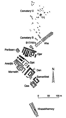La Necrópolis de Abidos está compuesta por tres cementerios principales: el Cementerio U, el Cementerio B y Umm el-Qaab. Los Cementerios U y B, se desarrollaron a lo largo del tiempo desde el norte hacia el sur. El Cementerio U, (el cual no entra dentro de este estudio), se encuentra en la parte noroeste del área implicada. Ésta área está densamente ocupada por tumbas de Naqada I y II con tumbas más grandes del tardío Naqada II y del principio de Naqada III a lo largo de sus periferias sureste y noroeste. Más al sur hay un puñado de tumbas grandes, bastante dispersadas, de mediados de Naqada III que se funden en el Cementerio B. Las últimas comprenden tres o cuatro grandes tumbas de doble cámara y la más grande, una tumba de tres cámaras atribuidas al rey Aha (de la Dinastía I). En Umm el-Qaab, al sur se extienden las tumbas masivas de los sucesivos reyes de la Primera Dinastía y de una reina madre llamada Merytneith. Finalmente, al noroeste de las tumbas de la Dinastía I está la de Peribsen, y en el extremo sur está la tumba de Khasekhemwy, los dos últimos faraones de la Dinastía II. Esta atribución de las tumbas es la aceptada hoy en día por la mayoría de los egiptólogos, aunque investigadores como Emery (EMERY, 1961:49-104) afirmen que las tumbas de los faraones de las Dinastías I y II se encuentran en la necrópolis de Saqqara. En la actualidad, estas tumbas de Saqqara han sido asignadas a los nobles de este periodo.