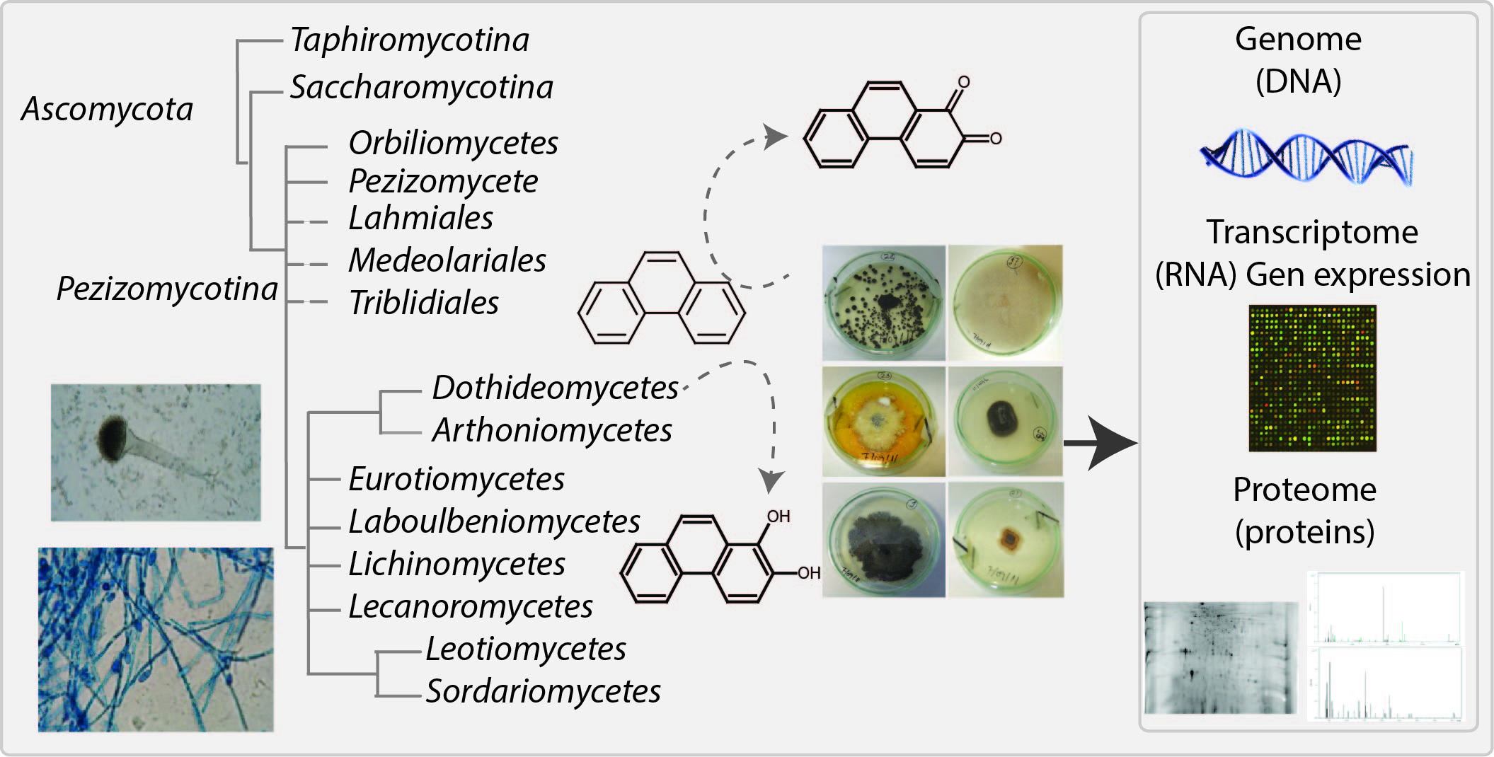Los hongos filamentosos representan la mayor biomasa en suelos y poseen unas características fisiológicas que les confieren grandes ventajas adaptativas para desarrollarse tanto en suelos como en aguas. Su metabolismo saprofítico, la capacidad para formar redes de micelio en soportes sólidos y su capacidad para secretar enzimas oxidativas extracelulares inespecíficas, hacen que estos microorganismos resulten de especial interés para su empleo en procesos de biorremediación. Estos procesos pueden llevarlos a cabo bien mediante transformación química o bien por adsorción y modificación de la biodisponibilidad. Además, en condiciones naturales, las hifas se utilizan como vía de desplazamiento para bacterias a través de los poros del suelo, colaborando con éstas en los procesos biodegradativos. Sus aplicaciones en procesos de biorremediación se han puesto de manifiesto en diversas especies de hongos, tanto con hongos de naturaleza ligninolítica productores de enzimas extracelulares, como de hongos no ligninolíticos aislados de zonas contaminadas, los cuales muestran una especial tolerancia para soportar elevadas concentraciones de contaminantes. Así, se ha demostrado la capacidad de biotranformación de compuestos aromáticos derivados del petróleo como BTEX, hidrocarburos policíclicos aromáticos, compuestos organoclorados, como algunos pesticidas, colorantes sintéticos provenientes de la industria textil y papelera, residuos agroindustriales de naturaleza lignocelulósica y fármacos, entre muchos otros. La variabilidad y fisiología de estos microorganismos les hace únicos y su estudio permite la aplicación de los hongos filamentosos en procesos diana de transformación de xenobióticos, produciendo sustancias generalmente menos tóxicas y más solubles y por tanto, asimilables por otros microorganismos. En este contexto, el grupo de Microbiología Ambiental del Instituto del Agua aborda la temática de la micología ambiental basado fundamentalmente en las siguientes líneas de investigación: |