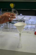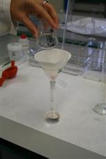 3. Transvasar la mezcla anterior a través de un embudo, con ayuda de una varilla de vidrio, al matraz aforado de 250 ml y lavar el matraz Erlenmeyer con 50 ml de alcohol al 40%.