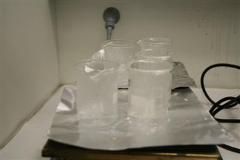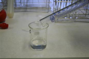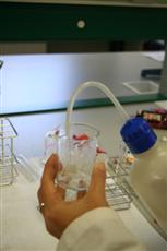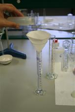 7. Llevar a evaporación en la placa calefactora hasta 100 ml aproximadamente para eliminar el alcohol. Dejar enfriar y transvasar el líquido a otra probeta enrasando hasta 200 ml con agua destilada.