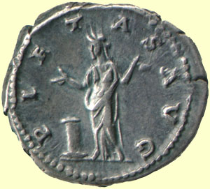 Pietas, el personificación de piety y dedicación al deber. Éste era uno de los valores romanos más importantes. El deber incluyó el deber para realizar los sacrificios apropiados en los tiempos apropiados a los dioses, a la lealtad e incluso a la adoración del emperador como dios, y al deber de un hijo a su padre. Pietas se puede demostrar velado, y se demuestra a menudo sacrificar sobre un altar fuera de un Patera.