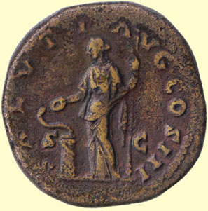 Salus la personificación de la salud y de la seguridad. Sus cualidades son una serpiente sostenida en brazos o arrollada en la tierra, levantando su cabeza mientras que ella la alimenta de un Patera. El adorno de una mujer que alimenta una serpiente se basa probablemente en el costumbre latino antiguo del tener un sacrificio virginal joven de la oferta a los dioses. Salus es un tema bastante popular para los reveses de las monedas romanas.