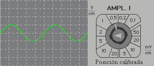 Se trata de un conmutador con un gran número de posiciones, cada una de las cuales, representa el factor de escala empleado por el sistema vertical. Por ejemplo si el mando esta en la posición 2 voltios/div significa que cada una de las divisiones verticales de la pantalla (aproximadamente de un 1 cm.) representan 2 voltios. Las divisiones más pequeñas representaran una quinta parte de este valor, o sea, 0.4 voltios. La máxima tensión que se puede visualizar con el osciloscopio presentado y con una sonda de 10X será entonces: 10 (factor de división de la sonda) x 20 voltios/div (máxima escala) x 8 divisiones verticales = 1600 voltios. En la pantalla se representa una señal de 1Vpp tal como la veríamos en diferentes posiciones del conmutador.