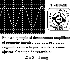 Consta de un conmutador de varias posiciones que nos proporciona el tiempo que el osciloscopio retarda la presentación desde el momento que la señal se dispara, este tiempo puede variar, dependiendo del osciloscopio, desde algunas fracciones de µsg a algunos centenares de msg; posee también, y generalmente concéntrico con el anterior, un mando variable para ajustar de forma más precisa el tiempo anterior. Y por último, un conmutador que en una posición etiquetada como search indica al osciloscopio que busque el punto a partir del cual deseamos que se presente la señal y otra posición etiquetada como delay que fija la anterior posición y permite el uso de la base de tiempos para amplificar el detalle deseado.