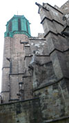 También fieles y turistas han colaborado aportando dinero voluntariamente mediante la campaña “Patrocina una piedra” -consistente en la simbólica restauración de una piedra por 10 euros- y, no tan voluntariamente, pagando para poder visitar el templo en los horarios en que no hay culto. Las intervenciones hasta el momento A pesar de que las obras no comenzaron hasta enero de 2005, dos años antes había sido colocada una malla verde en la fachada y en las ya restauradas torres laterales, puesto que el desprendimiento de piedras podía resultar peligroso para los transeúntes. En mayo de 2004 se firmó la rehabilitación de la fachada y se colocó un andamio y el 16 de diciembre de ese mismo año Zazurca y Fuses presentaron el proyecto, explicando que aquélla estaba peor de lo que se pensaba y, consecuentemente, el presupuesto había ascendido casi al triple de lo calculado en un primer momento, algo que afectaría en la evolución de la obra. Por lo que respecta al cimborrio, el inicio de su restauración se ha venido retrasando hasta el pasado mes de marzo. El principal problema que afecta a la Seo de Barcelona, este deterioro de la piedra, viene ocasionado por la utilización de hierro en su construcción. Considerada fundamentalmente gótica – aunque ya existió en este mismo emplazamiento una basílica pre-románica y un posterior edificio románico- fue finalizada, reformada y, podríamos decir, concluida entre finales del siglo XIX y principios del XX, momento en que tuvo lugar la construcción de la actual fachada, añadida a la del siglo XIV. En aquella época, y siguiendo los cánones del modernismo, muchos de los edificios de la ciudad de Barcelona utilizaron el hierro forjado en los elementos decorativos, pero también como técnica de sujeción entre las piedras, y así se hizo en las obras que se llevaron a cabo en la Catedral durante este periodo. Con el paso del tiempo, el agua de lluvia y el alto grado de humedad que caracteriza a la ciudad han ido oxidando estas piezas de hierro provocando, con su consecuente aumento, que la piedra se quiebre y acabe cayendo. La cuestión añadida, en el caso que nos ocupa, es la defectuosa canalización del agua de lluvia, hecho que ha contribuido aún más en la creación de óxido; con la intención de paliar este problema, el año pasado se arregló la barandilla y parte de la terraza para reconducir el agua. En cuanto al hierro en sí, en la Seo barcelonesa se habían utilizado unas grapas de aproximadamente medio metro para sujetar la fachada neogótica a la gótica. La sorpresa para los arquitectos fue encontrar prácticamente una barra por bloque, motivo por el cual se tendrá que intervenir casi en el 30% de la fachada, parte que deberá ser desmontada y vuelta a montar con piedra nueva. En el cimborrio y las dos torres laterales se hallaba el mismo defecto: la utilización de aros y gafas para la unión entre piezas ha acabado por romper el material constructivo y muestra del deterioro ha ido quedando patente en la cubierta del templo, donde se han encontrado gran cantidad de fragmentos provinentes de las zonas más altas del mismo. Pináculos, remates y gárgolas, los elementos de mayor inestabilidad, permanecerán revestidos con mallas y lonas hasta que sean restaurados, evitando así que, mientras llega ese momento, se desprendan restos que vayan a parar a la calle. La solución adoptada en este edificio consiste en sustituir los aros y grapas de hierro por otros de titanio y cambiar, en los casos necesarios, las piedras en mal estado, colocando otras en su lugar. Por suerte, en los depósitos municipales se conserva un remanente procedente de la cantera de Montjuïc, la misma piedra utilizada en la Catedral hace aproximadamente un siglo. De todas formas, y puesto que no habrá suficiente para toda la obra, se ha traído un tipo de piedra de Escocia, de características muy similares a la local. La idea del equipo encargado de la rehabilitación es conseguir un resultado lo más fidedigno posible al original, contando con el minucioso trabajo de verdaderos artesanos y copiando algunas de las técnicas utilizadas en aquel entonces, las cuales han sido descubiertas durante la fase de diagnóstico. Precisamente, la falta de documentación sobre la intervención de finales del siglo XIX y principios del XX supuso otro de los obstáculos para los actuales trabajos y, de hecho, ha sido gracias a los estudios previos para la realización del proyecto de restauración, y a la propia restauración llevada a cabo hasta el momento, que ahora se tiene una mayor información sobre esta construcción. La primera fase de las actuales obras la constituyó la torre derecha -la que da a la calle dels comtes - entre enero y julio de 2005. Era la intervención de mayor urgencia, puesto que este elemento estaba tan dañado que entrañaba el peligro de caerse: la oxidación, en este caso, había provocado unas grietas de tal índole que ocasionaron la desaparición de las juntas de unión, e incluso se había ido cayendo el mortero. Tras sustituir las piezas de hierro por otras de titanio y reponer aquellas piedras que debían extraerse, se realizó una limpieza en seco, con una pistola que consigue arrancar la suciedad mediante la proyección de cristales muy pequeños. Gracias a esta técnica se ha conseguido ver cómo eran las figuras que adornaban la torre, llegando a sorprender el detallismo de las mismas; sin embargo, a pie de calle es imposible apreciarlas. Meses después de haber acabado con ella, se llevó a cabo la limpieza de la torre derecha. A día de hoy, el andamio continúa ocultando la fachada principal aunque ya se ha desmontado un tercio del mismo, debido a la finalización de la restauración de las dos torres. El día 16 de marzo del presente año acabó de colocarse una grúa de 90 m de altura para posibilitar la instalación de otro andamio, mediante el cual se procederá a los trabajos del cimborrio. La ubicaci