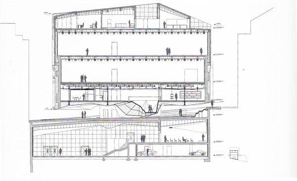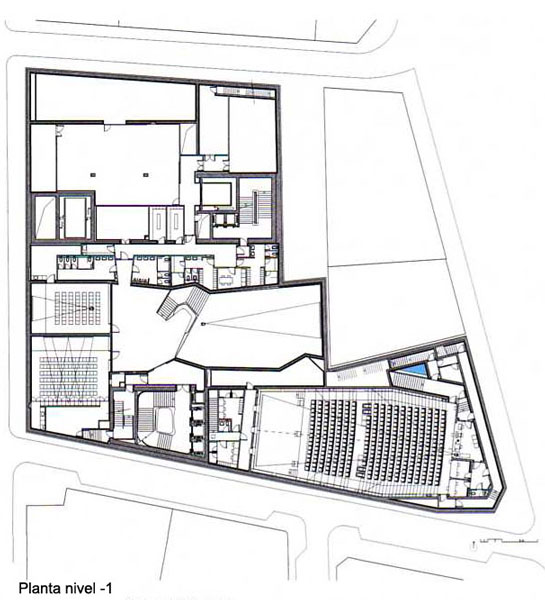El proyecto: La estrategia de actuación se ha desarrollado sobre cuatro principios básicos: 1. Restauración de la envolvente de ladrillo de forma artesanal 2. Eliminación del zócalo perimetral de piedra de fábrica 3. Apertura de una nueva plaza pública con entrada por el paseo del Prado 4. Añadir volumetría. El proyecto se completa con la creación de un muro vegetal, a cargo de Patrick Blanc junto a la medianera del número 34 del Paseo del Prado. La intervención ha supuesto la ampliación de la superficie de la fábrica ( 2000 m2 ) hasta los 8000 m2 . El nuevo edificio dispone de siete niveles, dos de ellos bajo rasante. Sobre la planta baja a cielo cubierto y que da continuidad a la plaza pública, con entrada por el número 36 del Paseo del Prado se han construido cuatro nuevas plantas. El conjunto alcanza una altura total de casi 28 metros . El diálogo arquitectónico que se debia producir entre el volumen existente y la nueva ampliación se resuelve a través de la contraposición de materiales (ladrillo cerámico-acero cortén) y geometrías ( composición clásica- planos, pliegues y texturas). El programa que alberga el edificio se distribuye de la siguiente forma: Nivel -2 Aparcamiento, acceso de obras de arte, foyer* y auditorio*
