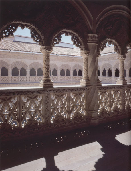 Descripción del Colegio de San Gregorio En la fachada destaca la portada de estilo gótico tardío, enmarcada por dos contrafuertes divididos en tres alturas. El vano de la puerta está cubierto por un arco carpanel, sobre el cual hay un arco trilobulado con forma conopial en el lóbulo central. La parte superior, dividida en tres calles se remata con una crestería. Todo el frente está profusamente decorado con temas copiados directamente del natural, hombres salvajes, naturaleza virgen y temas heráldicos destacan la influencia de los recientes descubrimientos de América y África. El acceso se realiza a través de un patio de ingreso constituido por un cuadrilátero rodeado de ocho pilares de sección lobulada. El edificio se organiza alrededor de un patio central de planta cuadrada y dos alturas. En la inferior encontramos esbeltos pilares torsos que sostienen arcos rebajados, con decoración de bolas, cruces dominicas y escudos de fray Alonso. El segundo piso presenta la misma estructura con una novedad: los vanos están geminados y unidos entre sí por antepechos calados, sobre los que se apoyan columnillas cuyos capiteles sostienen tímpanos profusamente decorados. El jardín del Colegio está ocupado por la capilla funeraria de fray Alonso, de estilo gótico hispano flamenco. Junto a ella, en el jardín, hubo un cuerpo del edificio del que solo queda la fachada. Comunicado con el Colegio de San Gregorio, en la parte posterior tenemos una construcción más reciente, levantada en 1524, conocida como el edificio de las azoteas, llamado así por los cuerpos salientes de su cubierta que emergían sobre las demás construcciones.