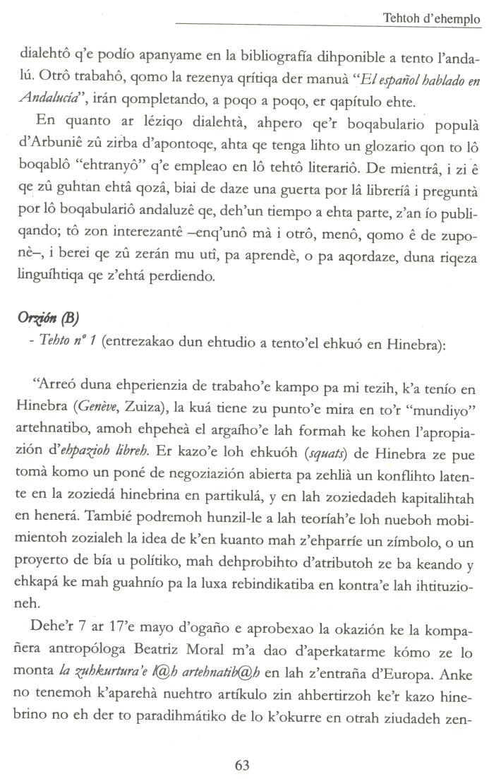 Ha aparecido un libro titulado ¡Ehkardiyea l'armaziga k'ai hugo! Antolohía'e tehtoh en andalú, der Huan Porrah Blanko (San Sebastián, Editorial Iralka, 2000). ¿Qué pensar de él? El libro referido (véase una página de muestra) reúne diversos materiales que vienen a proponer la hipótesis de constituir el andalú en lengua independiente del español. Dejemos para los lingüistas el desmontar los "fundamentos" teóricos en que tal cosa pretende ampararse. Limitémonos, por el momento, a formular algunas consideraciones generales, con el debido respeto a las personas, pero sin reparos a la hora de enjuiciar críticamente las ideas. Parece claro que el sentido y la función de una lengua radica en su capacidad para la comunicación. Cuanto mayor sea la comunidad lingüística, más amplia, fácil y eficiente será la comunicación. El español que hablamos en Andalucía participa de una lengua sólida, unida en su diversidad y diversa en su unidad. A contrapelo de eso, contemplamos la manufactura de una sedicente lengua andaluza, con aires de Frankenstein idiomático. El procedimiento consiste en hacer acopio de cuantas formas incultas ha sido posible registrar, por heteróclitas y dispersas que sean, tomadas del habla de algunos andaluces de aquí y de allá. Luego, selecciona una de las variantes -cuanto más palurda, mejor- y se someten a eliminación todas las demás. Los muñidores de esta neolengua convierten las anomalías catetas en la norma del andalú, excluyendo en lo posible y proscribiendo las formas prosódicas y ortográficas correctas, del español normal, reputadas ajenas al andaluz. En un alarde de empirismo mostrenco, perversión epistemológica, manipulación de autores e ideología etnicista, Huan Porrah (sic) junto a otros colegas citados en bibliografía, presentan, puesto por escrito, un engendro teratológico, tan innecesario como insolente, y ofensivo para quienes hablamos dentro de la variabilidad corriente del español por estas tierras. Estamos ante un caso como el de esas lenguas que, habiendo ya una lengua común, se inventan y aprenden para incomunicarse de los demás, traicionando así el sentido elemental de lo que debe ser socialmente una lengua. Invocar, como hace el citado Huan Porrah, un principio implícito que reclama para las diferentes ejecuciones o realizaciones fonéticas del español el estatuto de una lengua aparte supone un disparate de tal calibre que equivale a planear un atentado mortal contra la lengua común. A todas luces fracasará, pero lo que se propone es, ni más ni menos, dinamitar arteramente la lengua española y fraccionarla en un sinnúmero de dialectos, que tenderían con el tiempo a hacerse ininteligibles entre sí. ¿Quién saldría ganando con la destrucción del valor de comunicación transnacional que posee esta bella síntesis que es el español? Sólo un iluminado querría segregar a Andalucía de la comunidad de los hispanohablantes. En el libro mencionado nos topamos con una muestra de funesto particularismo diferencialista, cuyas consecuencias prácticas no serían otras, en el más inocuo de los casos, que el desperdicio de energías, que se encaminarían mucho mejor hacia el cultivo del español común, ya sea en el campo de la narración, la poesía, las ciencias, los medios, la vida cívica o Internet. Infeliz la gente joven que se que ilusione incautamente con semejante mascarada del andalú: acabarán descarriados en una pérdida de tiempo, quizá de dinero y sin duda de la sensatez. Las lenguas no son, claro está, inmutables ni eternas, sino históricas. Como todas, la española evoluciona, pero, en un contexto como el actual, en los antípodas del aislamiento comunicativo, tiende más bien al reforzamiento de su unidad y a favorecer la síntesis y la comprensión entre todos sus hablantes. Resulta una chaladura promover e hipostasiar las formas distorsionadas e incultas, e inventar a partir de ellas nada menos que una «lengua», lo que conduciría a la ruptura de comunicación y la incomprensión con los demás. En efecto, se pretende romper la transición gradual existente, que asegura el flujo inteligible de la información entre las ejecuciones más formales y las más relajadas de la misma lengua, entre sus variantes territoriales y poblacionales. No es bienvenido ese proyecto que postula la separación y el aislamiento lingüístico de los andaluces, exhortados a formar una secta que opta por constituir en sistema una caricatura vergonzosa del habla andaluza, cocinada como un gazpacho indigesto al que se han añadido cuantas variantes erróneas, corruptas, ramplonas, idiotas y palurdas pueden encontrarse ocasionalmente. Tal proyecto de convertir las anomalías en norma nos parece un proyecto abyecto. Es lesivo para la sociedad andaluza, intolerable, denunciable ante la opinión pública y las instituciones educativas. Pues implica una propuesta aberrante de hacernos lingüísticamente marginales, mutantes y sectarios, y esto no merece ninguna simpatía sino tanto desprecio como la destructividad y la irresponsabilidad sociocultural que entraña. La lengua española que de hecho hablamos es suficientemente buena y universal como para que merezca la pena cuidarla, cultivarla, respetarla. Se trata de enriquecerla y enriquecernos con ella, no de desbaratarla. Todas las variantes prosódicas peculiares que se dan en Andalucía son perfectamente alomorfas e inteligibles. Pero la sarta de variantes distorsionadas e incultas, que nuestros padres fundadores del andalú pretenden consagrar, cabe tenerlas por residuales, pues con su desaparición nada se perdería. Es un abuso y una falsificación el remarcar todo lo que difiere o separa, ocultando lo que une e identifica el habla andaluza con el español. La identidad compartida en el plano de la lengua es infinitamente mayor que las diferencias en la ejecución y los rasgos dialectales que pueda haber. Definir la propia identidad mediante el acantonamien