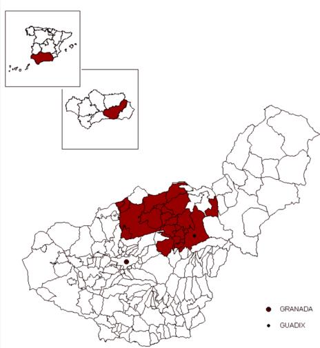 2. Métodos y fuentes 2.1. Zona y población de estudio Nuestro trabajo concierne a la población gitana de 22 municipios de la provincia de Granada (véase mapa en el gráfico 1), cercanos a la ciudad de Guadix, una de las más antiguas de Andalucía, situada a unos 50 km de Granada capital y que ha sido durante siglos una encrucijada histórica de caminos, y nudo de comunicaciones entre la baja Andalucía y Levante, Madrid y el Mediterráneo oriental. La zona de estudio incluye una variedad de asentamientos y comunidades en el continuo rural-urbano desde pequeñas aldeas rurales hasta una ciudad de servicios. En las últimas décadas esta zona se ha visto sometida a una intensa regresión demográfica fruto de la emigración a la capital y a otras regiones españolas, además de un creciente envejecimiento de la población. Aquí viven unas 50.000 personas, de las cuales cerca de 7.000 se identifican como gitanos y gitanas, suponiendo, por tanto, en torno al 14% de la población total. En varios de los municipios estudiados encontramos algunas de las concentraciones de población gitana más importantes de España e incluso de Europa occidental, llegando en varios casos a superar el 25 por ciento de la población total (Gamella 1996). La zona de estudio se integraría en un amplio conjunto de pueblos, agrociudades y barrios urbanos interrelacionados en toda la provincia e incluso algunas limítrofes y que comprende desde La Vega de Granada hasta Baza, incluyendo enclaves de enorme resonancia calé en el Sacromonte y el Albaicín, así como los de nueva planta en la "Zona Norte" de la capital (Almanjáyar, Cartuja, Haza Grande…) y que configuran en su conjunto el "corazón gitano" de Andalucía oriental. Aquí la presencia gitana está documentada desde finales del siglo XV.