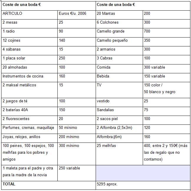 1999), en: 19. Consideramos que 1 dinar equivale a 1 céntimo de euro, pero normalmente su valor varía respecto al euro según el mercado negro de Nouakchott. Durante el año 2003 el dinar estaba más barato (por cada 100 dinares tenías 110 céntimos de euro) y en el 2006 más caro (por cada 100 dinares tenías 0,92-0,95 céntimos de euro). 20. El franco toma el nombre de la moneda francesa pero no su valor, que es un medida autóctona inventada. 21. David de Juan Canales, "Oigo una voz caminando", en Conocimiento y transformaciones sociales. Madrid, Editorial SEPHA, 2007. 22. Exponemos algunos objetos cotidianos con el fin de hacernos a la idea del coste familiar. Por ejemplo no hemos incluido objetos o productos relacionados con el aseo personal. 23. Exponemos elementos de la vestimenta básicos y sin profundizar en cuántos serían necesarios. 24. http://www.wfp.org/operations/current_operations/project_docs/101721.pdf (página7) 25. Normalmente se bebe agua de las cisternas, muy fluorada, que provoca que los dientes se ennegrezcan. Consideramos necesario que las personas beban agua salubre, y para ello hay que pagarla. El verano es tan caluroso y seco que el agua del cuerpo se evapora rápidamente, por lo que es necesario incrementar su consumo y el gasto. 26. En tetrabrik es de leche de vaca. La leche en polvo ½ k. sube hasta 1,30 €. Se prefiere leche de camella porque tiene más alimento y menos grasas según la tradición. 27. Hablamos de la harina que trae el PAM u otras instituciones, pero a veces no es suficiente puesto que se utiliza para hacer pan casero o tortas fritas de harina con azúcar. 28. El PAM suministra azúcar, pero no en cantidades suficientes, ya que es un producto saludable muy utilizado para hacer el té, y por lo tanto un elemento cultural imprescindible en las reuniones sociales. En torno al té existe una importante actividad social. 29. El PAM e