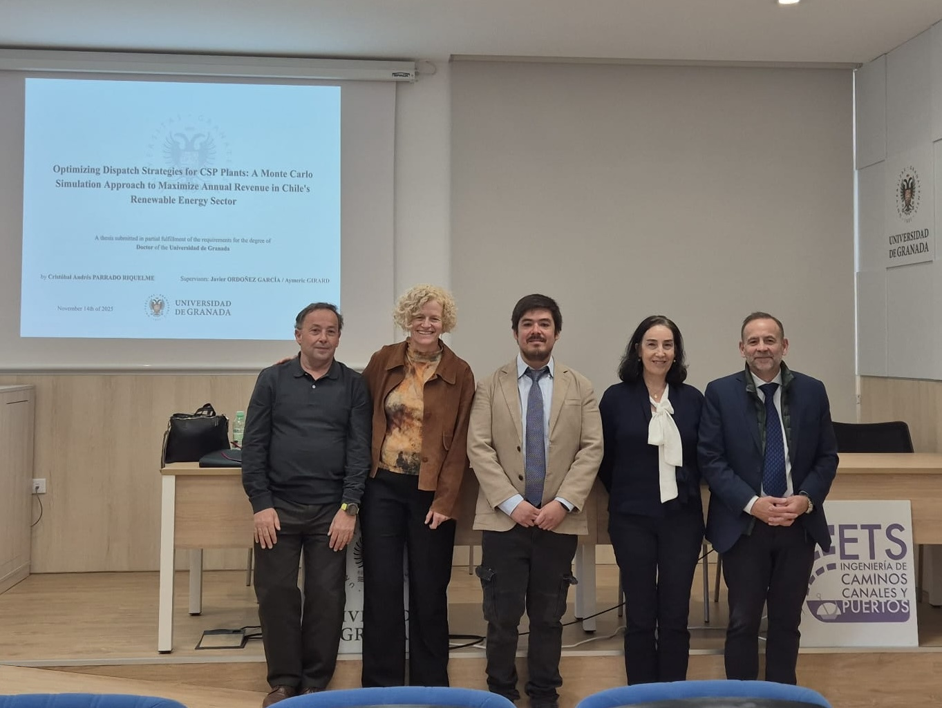 After several years of collaboration, and overcoming numerous challenges, on November 14, our collaborator and professor at Andrés Bello University, Cristóbal Parrado, successfully defended his doctoral thesis entitled "Optimizing dispatch strategies for CSP plants: a monte Carlo simulation approach to maximize annual revenue in Chile's renewable energy sector" before a committee composed of Professors