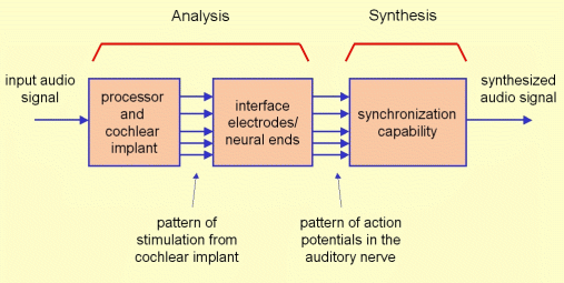 A first part of this block just consideres the signal processing performed by the cochlear implant system, and through this part, the loss of information associated to the configuration of the cochlear implant and the coding strategy can be represented. A second part of the analysis block represents the interaction between the electrode array and the neural ends, and describes how the pattern of activity in the electrodes is transformed into a pattern of activity in the auditory nerve.