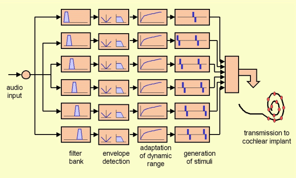 This model allows to consider the main aspects conditioning the perception through a cochlear implant, as the coding strategy, the design of the filter bank, the stimulation rate, the number of channels, the size of the cochlear implant, the allocation of the electrode array, the interaction between the implant electrodes and the neural ends, etc. The signals synthesized according to this models represent the information loss associated to the stimulation through the cochlear implant and this way this allows normal-hearing subjects to hear the sound like it would be perceived by a cochlear implant patient.