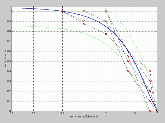In order to evaluate the effect of the interaction among channels we have prepared tests in which the channel interaction coefficient has been modified for the simulation. The results are shown in figure 7. It can be observed that when the signal is synthesized with a small interaction coefficient, the quality of the synthesized sentence is perceived similar to that of the original sentence, but as this coefficient is increased, the quality of the signal is significantly degraded. The knee in these plots is observed for a coefficient around 1 or 2 mm, which suggests that the interaction between electrodes and neural ends can be modeled by means of the channel interaction coefficient by assigning a value close to 1 or 2 mm to this coefficient. This value is consistent with some previous observations and theoretical studies about the distribution of the density of current in the electrical system corresponding to the cochlea and the cochlear implant.