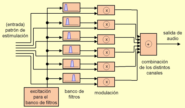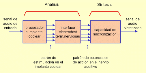 A partir del patrón de actividad en los electrodos, y de acuerdo con el modelo de interacción electrodos/terminaciones nerviosas, se determina el patrón de actividad neural para los grupos de terminaciones asociados a cada porción coclear. Finalmente, partiendo de este patrón de actividad neural se sintetiza la señal de audio teniendo en cuenta la capacidad de sincronización de la actividad neuronal y las frecuencias características de las porciones cocleares estimuladas.