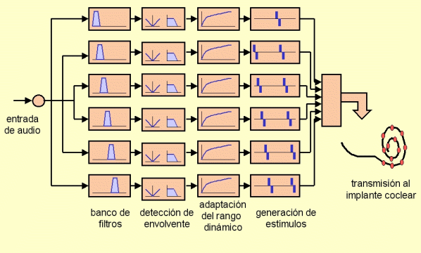 La figura 2 muestra el diagrama de bloques de un sistema de implante coclear convencional. La señal es adquirida por el micrófono del procesador y amplificada, pasando a un banco de filtros que la separa en distintas bandas de frecuencia. La salida de cada filtro es pasada a través de un detector de envolvente. De este modo, para cada canal se estima la energía que presenta la señal en cada banda de frecuencia y en cada instante de tiempo. El bloque de adaptación del rango dinámico sirve para transformar el rango dinámico acústico para cada canal, en el rango dinámico eléctrico que requiere cada electrodo del paciente. Esta transformación del rango dinámico es específica del paciente y diferente para cada uno de los electrodos. Finalmente, de acuerdo con la tasa de estimulación, el procesador genera los pulsos de estimulación que representan el nivel de corriente que se debe suministrar en cada electrodo en cada instante de tiempo. En estrategias pulsátiles (como estrategias CIS o n-de-m) los pulsos de estimulación se generan de modo que en cada instante de tiempo únicamente haya un electrodo activo, con objeto de evitar el fenómeno conocido como ``suma de campos''. Una vez establecido el patrón de estimulación en el procesador, éste es transmitido al implante coclear y los pulsos de corriente son generados a través de los electrodos del implante.