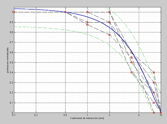 Figura 7: Ajuste de la puntuación de calidad normalizada frente al coeficiente de interacción.