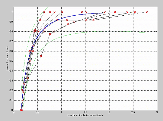 En la figura 4 se muestran los valores de puntuación de calidad normalizada frente a la tasa de estimulación considerada en la simulación. Se muestra también el ajuste correspondiente de estos datos. Cada punto de la gráfica representa la evaluación por un paciente de una frase sintetizada. Se muestra el ajuste polinómico por mínimos cuadrados y el intervalo de confianza del 95% correspondiente. Puede observarse que para tasas de estimulación muy altas, los pacientes no aprecian pérdida de calidad en la frase sintetizada, y a medida que la tasa es menor, la calidad va disminuyendo, obteniéndose puntuaciones muy bajas para tasas por debajo de 700 pps. Se observa el efecto de codo en la gráfica correspondiente a cada paciente, y se aprecia además que la tasa en la que se produce el codo es diferente para cada paciente, siendo mayor cuando la tasa utilizada en el procesador es mayor. Este resultado valida el procedimiento de simulación con respecto a la tasa de estimulación.