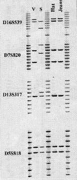 Ejemplo de un caso de criminalística resuelto utilizando electroforesis en gel vertical de acrilamida. Si se observan los patrones bandas podrá comprobarse como los perfiles obtenidos en las manchas de sangre encontradas en el sombrero (Hat) y pantalón (Jeans) del sospechoso (S) coinciden con el perfil genético de la víctima (V) |