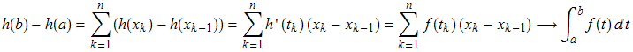 En la integral de Riemann, el área buscada se aproxima por rectángulos de la siguiente forma. Primero, se divide el intervalo [a,b] en un número finito de subintervalos [
