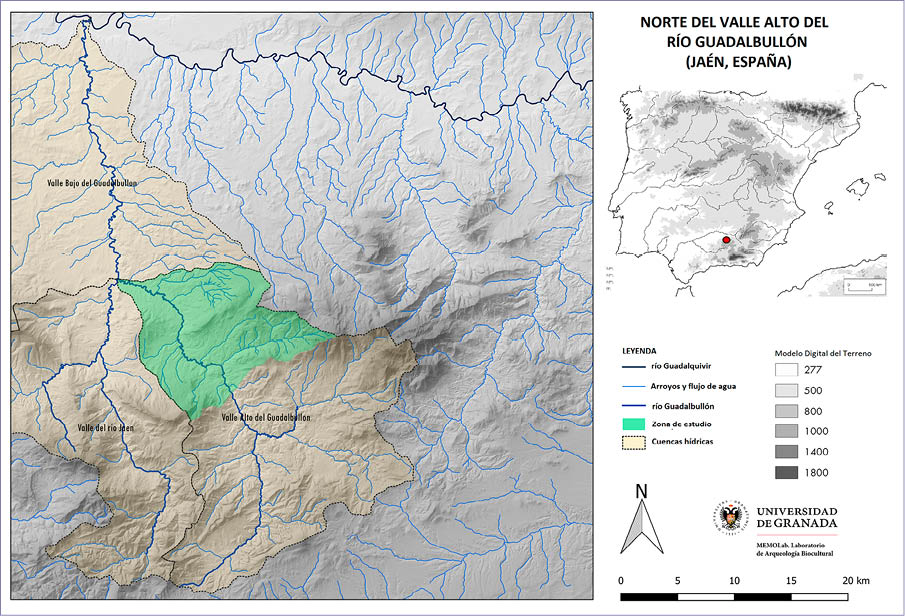 Nos referimos concretamente al norte del Valle Alto del río Guadalbullón cuya extensión abarca la zona de Pegalajar, La Guardia de Jaén y parte de Mancha Real (Fig. 1). El paisaje se caracteriza por una fuerte dualidad entre una extensión considerable de sierra, la cual se corresponde con múltiples dehesas en las estribaciones de Sierra Mágina, y otra extensión de valle que suaviza el relieve en dirección a la campiña jiennense y al valle del Guadalquivir. Deberíamos destacar algunas cotas que denotan esas características que comentamos: la Serrezuela de Pegalajar (1.127 m), el Cerro San Marcos (645 m), el Cerro San Cristóbal (1.003 m), Cerro Artesilla (1.197 m), el Morrón (1.355 m), Mojón Blanco (1.503 m), Cerro del Púlpito (1.479 m), Cerro Atalaya (1.325 m), el Almadén (2.036 m) y el Cerro de los Tres Mancebos (1.523 m) en la Sierra de Grajales. Por otro lado, destaca el valle del Bercho y el valle encajonado del río Guadalbullón. Todos estos hitos están provistos de esa toponimia crucial para este estudio.