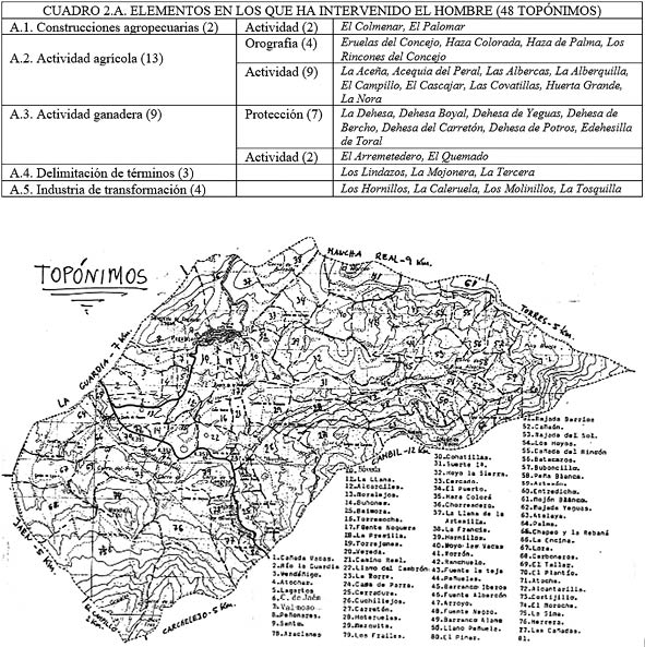 Fig. 2. (Arriba) Clasificación tradicional de topónimos según alusiones a la actividad económica. Fuente: LÓPEZ CORDERO y TORRES QUESADA, 2016: 282. (Abajo) Plasmación cartográfica generalizada de toponimia. Fuente: LOPEZ CORDERO et al. 1994.