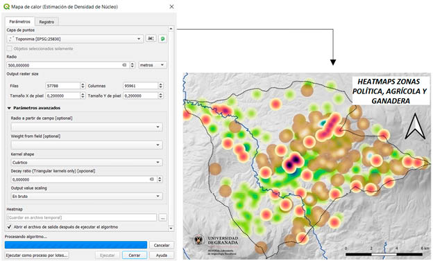 Con QGIS 3.10 se ha utilizado la herramienta Mapa de Calor (Estimación de Densidad de Núcleo). A partir del número de elementos existentes y conocidos (incluidos en la capa vectorial seleccionada), el análisis de densidad permite medir su ubicación en relación con el espacio, determinando si existe o no concentración de entidades vectoriales mediante la fórmula M = N(a)A (CAPDEVILA MONTES y MÍNGUEZ GARCÍA, 2013: 69). En dichos mapas resultados en el GIS se aplica un área de búsqueda circular que determina la distancia para buscar las ubicaciones de aquellos elementos o para expandir los valores alrededor de cada ubicación y calcular un valor de densidad. El valor introducido ha contado con un radio de 500 metros para cada uno de los elementos. Debemos de tener en cuenta que cuanto menor sea el área de estudio y mayor el tamaño de las celdas, mayor será la densidad, y viceversa.