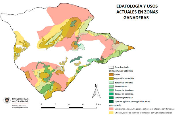 Verificamos que estos usos actuales heredados del pasado se localizan en los contextos de desarrollo más pobre y en las alturas más pronunciadas de la zonificación. Por una parte, la presencia de Litosoles, Luvisoles crómicos y Cambisoles cálcicos con Rendsinas en gran parte de la dehesa de la Serrezuela, de La Guardia de Jaén y de Sierra Grajales-Moroche como así su combinación con Cambisoles cálcicos, Regosoles calcáreos y Litosoles con Rendsinas en las mismas y en la de Bercho, nos lo confirma (Fig. 7). Esto nos lleva al argumento de que la baja fertilidad de la zona y el impedimento de un desarrollo agrícola notable, deja paso a un uso plenamente ganadero. Evadimos el hecho de que la sociedad andalusí y posteriormente la feudal hayan relegado voluntariamente a esta actividad a los márgenes altitudinales y longitudinales más acusados como si de una actividad de carácter secundario se tratase. Más bien, era reconocida como una actividad principal imbricada con la agricultura, que por motivos logísticos para su desarrollo ocuparía otros lugares. Hablaríamos de una convivencia sincrónica hasta el fin de la Edad Media. Posteriormente, a partir de la desaparición de la frontera en el s. XV, la convivencia de ambas actividades sería más patente en los mismos parajes.