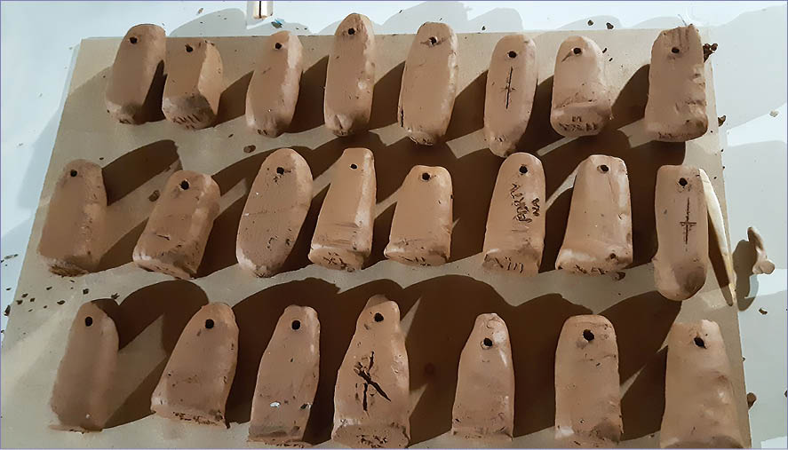 Una vez modelados todos los pesos se dejaron secar durante una noche antes de realizar las perforaciones destinadas a alojar la cuerda de suspensión. El secado se realizó como medida de precaución ya que la arcilla podía deformarse demasiado de hacerlos en fresco (Fig. 3). Así al día siguiente se realizaron los agujeros de forma manual. Primero se hizo una perforación con una aguja de hueso hasta la mitad de la anchura del peso y luego se continuó con una varilla de madera de 6 mm de calibre mientras se aplicaba un ligero movimiento de rotación para facilitar el deslizado de la madera por la arcilla. Pese a todas las precauciones, algunos de los pesos se agrietaron o deformaron, lo que más tarde influiría en la cocción.