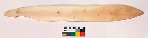Debido a que las características comunes que existen entre estos instrumentos sin importar su marco crono-espacial, nuestra réplica se ha realizado siguiendo estos ejemplos. Se trata de una réplica fabricada en madera, de 60 cm de largo y entre 0,4 y 0,6 cm de ancho. Ha sido fabricada a partir de un tronco de árbol de mayores dimensiones.