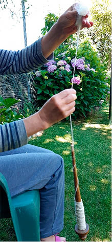 El hilado mediante uso lo realiza, como ya hemos dicho, sujetando el copo en alto con la mano izquierda, mientras la derecha imprime la fuerza de rotación al huso y rápidamente sube hacia el copo para estirar otro puñado de fibras que rápida mente se torsionan (Fig. 6). Este proceso se repite varias veces hasta que la longitud del hilo creado es demasiado larga como para ser cómodo de manejar. En ese momento, manteniendo cierta tensión en el hilo, se eliminan las pequeñas volitas de lana que quedan sobresaliendo del hilo y se deshace el nudo temporal. A continuación, siempre manteniendo la tensión, se enrolla sobre el fuste del huso y se vuelve a comenzar.