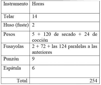 A esto ha de sumarse el tiempo de preparación y colocación de los hilos en el telar, diez horas, veinte las dos piezas, y el tiempo total de tejido, sesenta y cuatro horas.