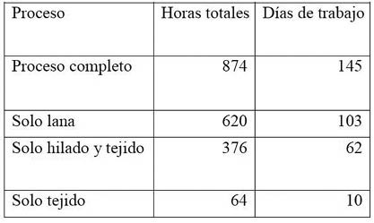 Como se puede observar, la realización todas las partes de la cadena operativa implican un enorme coste en horas de trabajo que suma un total de 874 horas. Si traducimos esas horas a jornadas de trabajo, tomando como referencia seis horas de trabajo diario, tendríamos que para obtener la prenda final harían falta 145 días (Tab. 3).