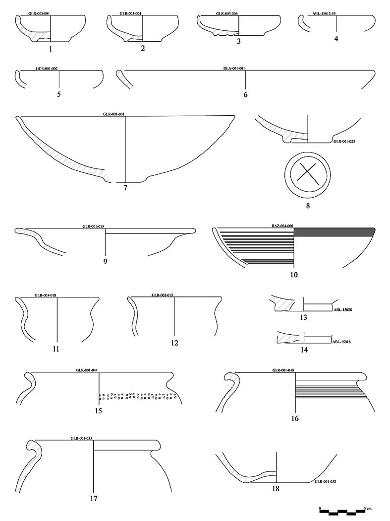 1. La repetición formal del material cerámico, representado exclusivamente por dos series: común ibérica, compuesta por cerámicas de pastas claras con variaciones formales muy escasas, cuencos de borde entrante (lám. 3, 4), platos de borde recto divergente (lám. 3, 6 y 7)) y borde vuelto (lám. 3, 9), asociados en el mundo ibérico con cierta frecuencia a funcionalidades propias de lucerna (en algunos casos, sobre todo en los cuencos de borde entrante, suelen encontrarse los bordes quemados, posiblemente por el uso más que por alteraciones en los procesos postdeposicionales); caliciformes (como en las cuevas-santuario) (lám. 3, 11 y 12) y platos de carena alta (que deberían relacionarse ya con una cronología algo más evolucionada de segunda mitad del siglo I a.C.). En segundo lugar, cerámica de cocina ibérica, representada por ollas, de pasta grosera y normalmente cocción reductora; en los yacimientos de la zona de Galera y Puebla de Don Fadrique es muy habitual una olla de cuerpo globular, fondo en ónfalo, cuello pronunciado, y labio ligeramente vuelto, pero que destaca sobre todo, en algunos casos, por decoración de cordones incisos en el contacto entre cuello y cuerpo (lám. 3, 16). Y por último, eventualmente aparece asociada cerámica ibérica pintada (lám. 3, 10) y de importación, como es el caso de Los Llanos en el Pasillo de Fiñana (cerámica ática de barniz negro) o del Cerro del Castillo de Galera (fragmento amorfo de ánfora Dr. 1A de pasta pompeyana).