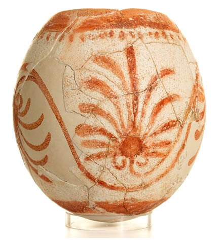 Fig. 1. Cáscara de huevo de avestruz decorada procedente de la necrópolis de Puig des Molins (Ibiza). Fuente: MAEF, 2022.